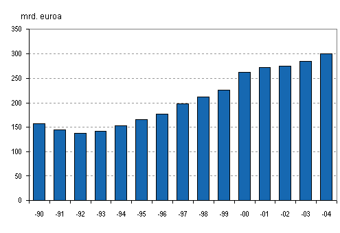 Yritysten liikevaihto käypiin hintoihin 1990-2004 (mrd. euroa)