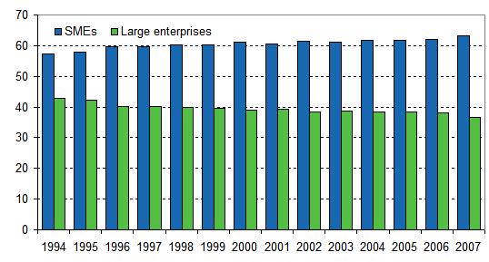 Shares of small and medium-size, and large enterprises of personnel 1994-2007, %