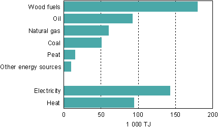 According to Statistics Finland data, energy use in manufacturing was 650 petajoule (PJ) in 2007 (confidence interval of the statistics is ± 1.1 per cent). Wood fuels were the most used source of energy in manufacturing. Of all the industries, the forest industry used the most energy. It accounted for almost 57 per cent of the total energy used in all manufacturing. Examined by region, manufacturing used the most energy in South Karelia, North Ostrobothnia and Itä-Uusimaa.