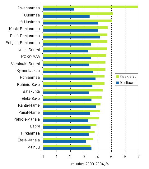 Eniten mediaanitulot kasvoivat vuonna 2004 Etelä- ja Keski-Pohjanmaan sekä Itä-Uudenmaan maakuntien kotitalouksilla, kasvua oli 4 prosenttia. Tulojen suhteellisia muutoksia tarkasteltaessa on hyvä muistaa se, että kotitalouksien tulojen tasot vaihtelevat merkittävästi maakunnittain. Selvästi korkeimmat tulot ovat Ahvenanmaan ja Uudenmaan kotitalouksilla, matalimmat Itä- ja Pohjois-Suomen maakuntien kotitalouksilla.