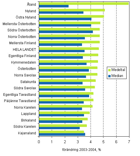 Mest steg medianinkomsterna år 2004 i hushållen i Södra och Mellersta Österbotten samt Östra Nyland, dvs. med 4 procent. Vid granskning av de relativa förändringarna i inkomsterna är det bra att komma ihåg att hushållens inkomstnivåer varierar mycket efter landskap. Åländska och nyländska hushåll har klart de högsta inkomsterna, hushållen i Östra och Norra Finland har de lägsta.