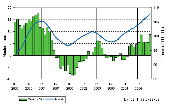 Teollisuusyritysten liikevaihto oli Tilastokeskuksen mukaan vuoden 2004 viimeisellä neljänneksellä lähes 9 prosenttia suurempi kuin vastaavalla ajanjaksolla vuotta aiemmin. Kasvu oli selvästi nopeampaa kuin aiemmilla vuosineljänneksillä. Sekä kotimaan liikevaihto että vienti piristyivät.
