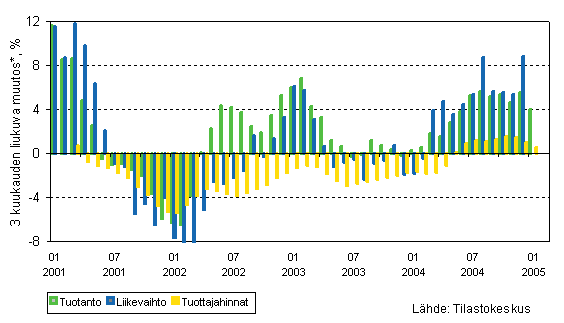 Liikevaihdon, tuotannon ja tuottajahintojen kehitys 1/2001 - 1/2005, kolmen kuukauden liukuvat vuosimuutokset