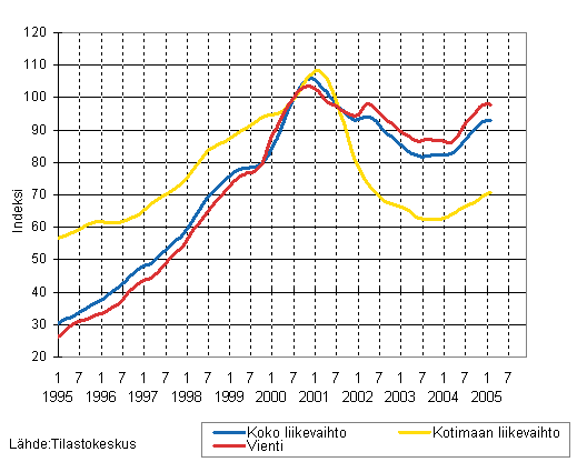 Sähkö- ja elektroniikkateollisuuden liikevaihdon, kotimaan liikevaihdon ja viennin trendisarjat 1/1995 - 2/2005, 2000=100