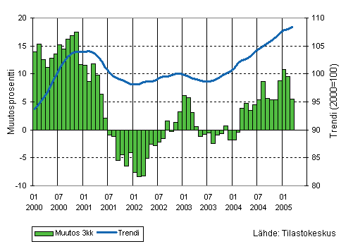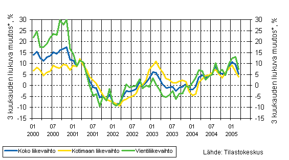 Teollisuusyritysten liikevaihto oli Tilastokeskuksen mukaan tammi-maaliskuussa 2005 runsaat 5 prosenttia suurempi kuin vastaavalla ajanjaksolla vuotta aiemmin. Vienti kasvoi ensimmäisellä vuosineljänneksellä 7 ja kotimaan myynti 4 prosenttia vuotta aiemmasta.