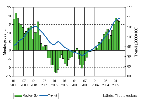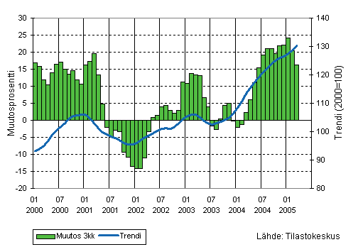 Tammi-maaliskuussa puu- ja paperiteollisuuden liikevaihto kasvoi 0,6 prosenttia vuotta aiemmasta. Kasvu oli hitaampaa kuin edellisillä vuosineljänneksillä. Kemianteollisuuden liikevaihto oli tammi-maaliskuussa 16,2 prosenttia edellisvuoden vastaavaa aikaa suurempi. Myös kemianteollisuuden kasvuvauhti hidastui hieman edellisiin vuosineljänneksiin verrattuna. Koneiden ja laitteiden valmistuksen kasvuvauhti kiihtyi edellisestä kolmen kuukauden jaksosta ja oli 16,0 prosenttia. Elektroniikka- ja sähkötuotteiden valmistuksen liikevaihdon kasvu oli tammi-maaliskuussa 17,2 prosenttia; kasvu oli hieman nopeampaa kuin vuoden 2004 viimeisellä vuosineljänneksellä ja selvästi nopeampaa kuin vuoden 2004 toisella ja kolmannella vuosineljänneksellä.