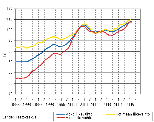 Koko teollisuuden liikevaihdon, kotimaan liikevaihdon ja vientiliikevaihdon trendisarjat 1/1995 - 3/2005, 2000=100