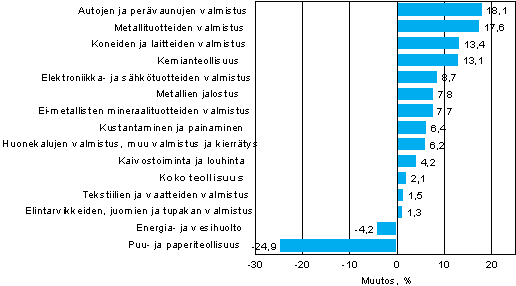 Liikevaihto kasvoi reippaasti kaikilla metalliteollisuuden alatoimialoilla sekä kemianteollisuudessa. Sen sijaan puu- ja paperiteollisuudessa liikevaihto pieneni lähes 25 prosenttia vuotta aiemmasta. Luvussa näkyy touko-kesäkuussa noin kuusi viikkoa kestäneen paperiteollisuuden työkiistan vaikutus. Paperialan työtaistelu edesauttoi myös energia- ja vesihuollon liikevaihdon alenemista.