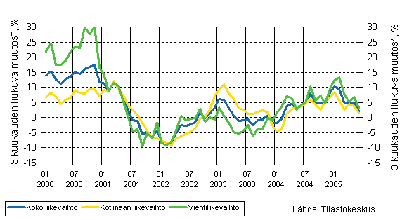 Koko liikevaihdon, vientiliikevaihdon ja kotimaan myynnin kehitys 1/2000 - 6/2005, kolmen kuukauden liukuva vuosimuutos, %