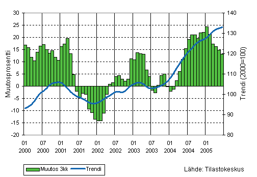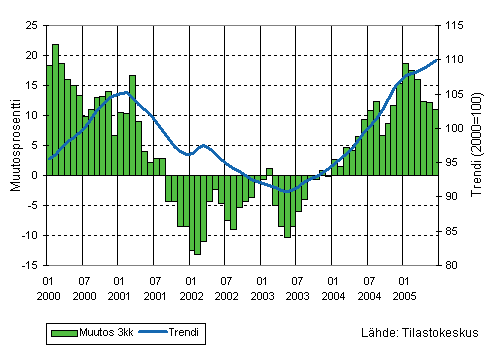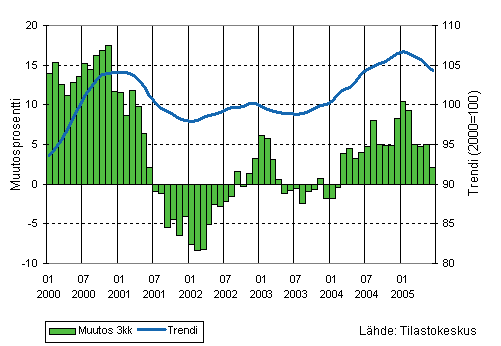 Teollisuuden liikevaihdon kolmen kuukauden liukuva vuosimuutos ja trendi 1/2000-6/2005, 2000=100
