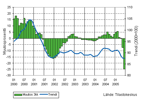 Puu- ja paperiteollisuuden liikevaihdon kolmen kuukauden liukuva vuosimuutos ja trendi 1/2000-6/2005, 2000=100