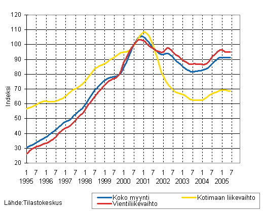 Sähkö- ja elektroniikkateollisuuden liikevaihdon, kotimaan liikevaihdon ja vientiliikevaihdon trendisarjat 1/1995 - 6/2005, 2000=100