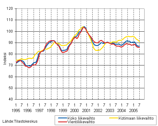 Puu- ja paperiteollisuuden liikevaihdon, kotimaan liikevaihdon ja vientiliikevaihdon trendisarjat 1/1995 - 7/2005, 2000=100