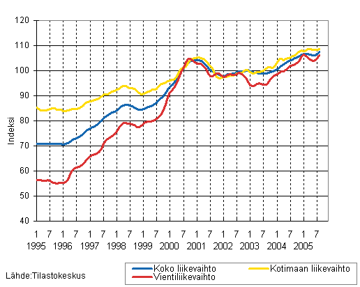Koko teollisuuden liikevaihdon, kotimaan liikevaihdon ja vientiliikevaihdon trendisarjat 1/1995 - 8/2005, 2000=100