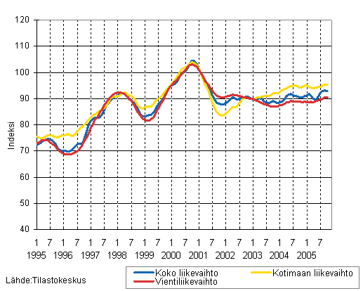 Puu- ja paperiteollisuuden liikevaihdon, kotimaan liikevaihdon ja vientiliikevaihdon trendisarjat 1/1995 - 10/2005, 2000=100