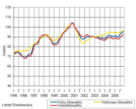 Puu- ja paperiteollisuuden liikevaihdon, kotimaan liikevaihdon ja vientiliikevaihdon trendisarjat 1/1995 - 11/2005, 2000=100