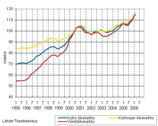 Koko teollisuuden liikevaihdon, kotimaan liikevaihdon ja vientiliikevaihdon trendisarjat 1/1995 - 2/2006, 2000=100