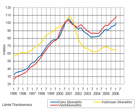 Sähkö- ja elektroniikkateollisuuden liikevaihdon, kotimaan liikevaihdon ja vientiliikevaihdon trendisarjat 1/1995 - 2/2006, 2000=100