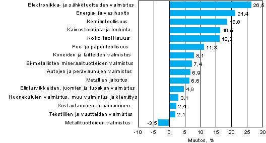 Liikevaihto kasvoi maalis-toukokuussa eniten elektroniikka- ja sähkötuotteiden valmistuksessa, 26 prosenttia, ja energia- ja vesihuollossa, 21 prosenttia. Myös kemianteollisuudessa ja kaivostoiminnan ja louhinnan toimialalla liikevaihto kasvoi ripeästi erityisesti hintojen nousun tukemana. Lisäksi koko teollisuuden liikevaihtoa kasvattivat ajanjaksolle osuneet risteilyalusten myynnit. Puu- ja paperiteollisuuden kasvuun vaikutti viime vuoden toukokuun alhainen vertailutaso tuotantoseisokkien vuoksi. Liikevaihto väheni vuotta aiemmasta ainoastaan metallituotteiden valmistuksessa.