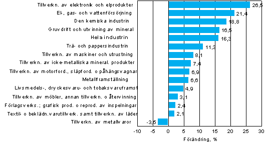 I mars-maj ökade omsättningen mest inom tillverkning av elektronik och elprodukter, med 26 procent, och inom energi- och vattenförsörjning, med 21 procent. Också inom den kemiska industrin samt gruvdrift och utvinning av mineral var ökningen av omsättningen snabb. Till detta bidrog särskilt prisstegringarna. Försäljningen av kryssningsfartyg under denna period gjorde också att omsättningen inom hela industrin ökade. Till ökningen av trä- och pappersindustrin bidrog den låga jämförelsenivån till följd av produktionsstoppen i maj förra året. Omsättningen minskade från året innan bara inom tillverkning av metallvaror.