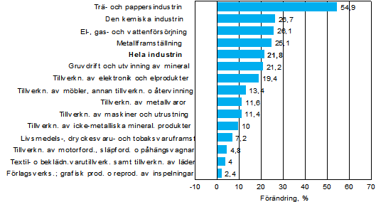 I maj-juli ökade omsättningen mest inom trä- och pappersindustrin, dvs. med 55 procent. Till ökningen inom näringsgrenen bidrog den låga jämförelsenivån under motsvarande period förra året till följd av produktionsstoppen. Också inom den kemiska industrin, energi- och vattenförsörjningen, metallframställningen samt gruvdrift och utvinning av mineral var ökningen av omsättningen snabb. Inom dessa näringsgrenar förklaras ökningen av omsättningen delvis med att producentpriserna har stigit, dvs. bland annat oljeprodukter, koppar och el har blivit dyrare. Omsättningen ökade snabbt också inom tillverkning av elektronik- och elprodukter.