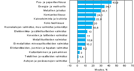 Liikevaihto kasvoi kesä-elokuussa eniten puu- ja paperiteollisuudessa, 44 prosenttia. Toimialan kasvuun vaikutti viime vuoden vastaavan ajanjakson alhainen vertailutaso tuotantoseisokkien vuoksi. Myös energia- ja vesihuollossa sekä metallien jalostuksessa liikevaihdon kasvu oli nopeaa. Näillä toimialoilla liikevaihdon kasvua selittää osittain tuottajahintojen nousu eli muun muassa öljytuotteiden, kuparin ja sähkön kallistuminen. Liikevaihto kasvoi myös muilla teollisuuden alatoimialoilla, vain autojen ja perävaunujen valmistuksessa liikevaihto pysyi ennallaan edellisvuoden vastaavaan ajankohtaan verrattuna.