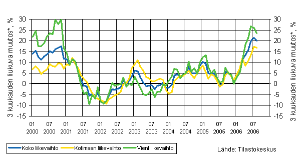 Koko liikevaihdon, vientiliikevaihdon ja kotimaan myynnin kehitys 1/2000 - 8/2006, kolmen kuukauden liukuva vuosimuutos, %