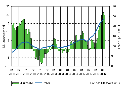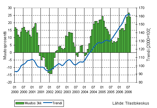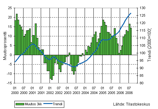 Teollisuuden liikevaihdon kolmen kuukauden liukuva vuosimuutos ja trendi 1/2000-8/2006, 2000=100