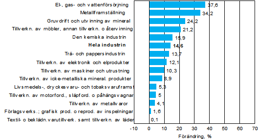 Under juli-september ökade omsättningen mest inom energi- och vattenförsörjningen, 37,6 procent. Ökningen inom näringsgrenen förklaras för sin del med ökningen av producentpriserna för elektricitet. Även inom metallframställningen samt inom gruvdrift och utvinning av mineral var ökningen snabb. Omsättningen gick upp under juli-september i alla undernäringsgrenar inom industrin. Långsammast var ökningen inom textiltillverkning och tillverkning av kläder.