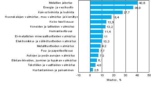 Liikevaihto kasvoi elo-lokakuussa eniten metallien jalostuksessa, 40,6 prosenttia ja energia- ja vesihuollossa, 36,8 prosenttia. Näiden toimialojen liikevaihdon kasvuun vaikutti perusmetallien ja sähkön kallistuminen. Myös kaivostoiminnassa ja louhinnassa liikevaihdon kasvua tuki tuottajahintojen nousu. Liikevaihto kasvoi elo-lokakuussa kaikilla teollisuuden alatoimialoilla. Hitainta liikevaihdon kasvu oli kustantamisen ja painamisen toimialalla.