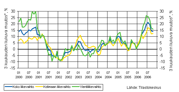 Koko liikevaihdon, vientiliikevaihdon ja kotimaan myynnin kehitys 1/2000 - 10/2006, kolmen kuukauden liukuva vuosimuutos, %