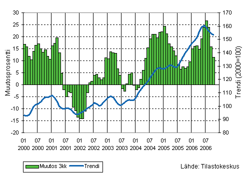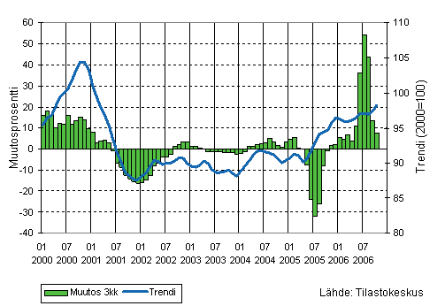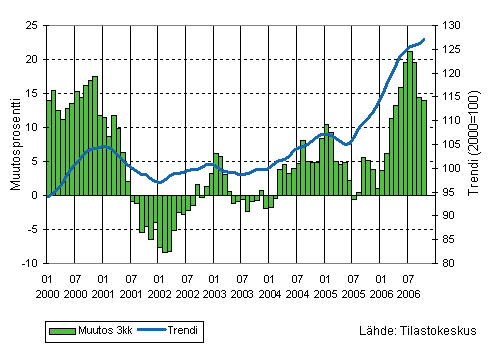 Teollisuuden liikevaihdon kolmen kuukauden liukuva vuosimuutos ja trendi 1/2000-10/2006, 2000=100