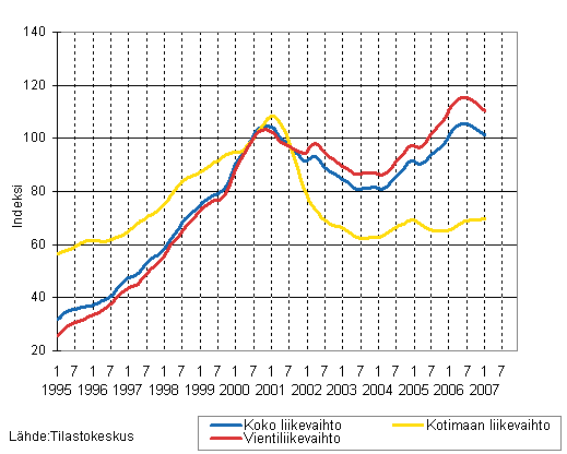 Sähkö- ja elektroniikkateollisuuden liikevaihdon, kotimaan liikevaihdon ja vientiliikevaihdon trendisarjat 1/1995 - 01/2007, 2000=100