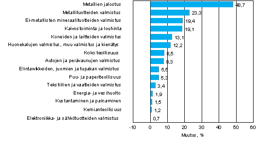 Liikevaihto kasvoi joulu-helmikuussa eniten metallien jalostuksessa, 48,7 prosenttia ja metallituotteiden valmistuksessa, 23,3 prosenttia. Näiden toimialojen liikevaihdon kasvuun vaikutti perusmetallien kallistuminen. Liikevaihto kasvoi joulu-helmikuussa kaikilla teollisuuden alatoimialoilla. Liikevaihdon kasvu hidastui edellisiin kolmen kuukauden ajanjaksoihin verrattuna etenkin kemianteollisuudessa, elektroniikka- ja sähkötuotteiden valmistuksessa sekä energia- ja vesihuollossa.