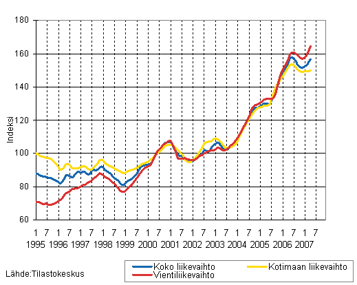 Kemianteollisuuden liikevaihdon, kotimaan liikevaihdon ja vientiliikevaihdon trendisarjat 1/1995 - 04/2007, 2000=100