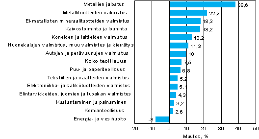 Liikevaihto kasvoi helmi-huhtikuussa eniten metallien jalostuksessa, 38,6 prosenttia ja metallituotteiden valmistuksessa, 22,2 prosenttia. Näiden toimialojen liikevaihdon kasvuun vaikutti perusmetallien kallistuminen. Suurimmista toimialoista liikevaihto kasvoi puu- ja paperiteollisuudessa 6,8 prosenttia, sähkö- ja elektroniikkateollisuudessa 5,1 prosenttia ja kemianteollisuudessa 2,6 prosenttia vuodentakaisesta. Liikevaihto kasvoi helmi-huhtikuussa kaikilla muilla teollisuuden alatoimialoilla paitsi energia- ja vesihuollossa.