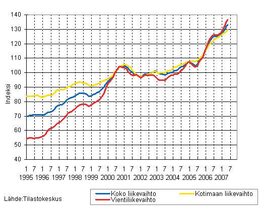Koko teollisuuden liikevaihdon, kotimaan liikevaihdon ja vientiliikevaihdon trendisarjat 1/1995 - 05/2007, 2000=100