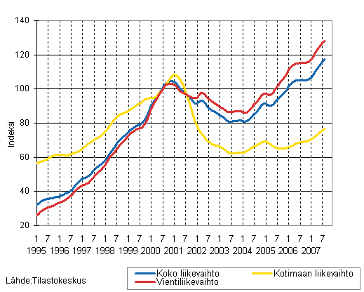 Sähkö- ja elektroniikkateollisuuden liikevaihdon, kotimaan liikevaihdon ja vientiliikevaihdon trendisarjat 1/1995 - 08/2007, 2000=100
