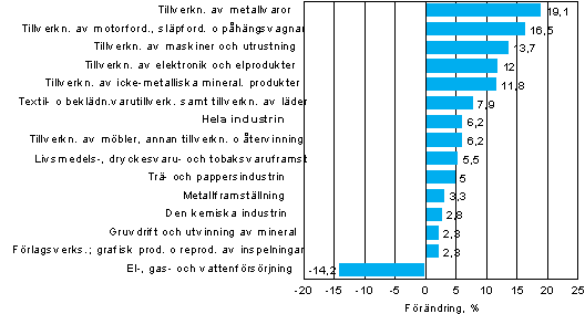 Omsättningen ökade under juni-augusti speciellt inom metallindustrins undernäringsgrenar. Mest ökade omsättningen inom tillverkningen av metallvaror, 19,1 procent, och inom tillverkningen av motorfordon, släpfordon och påhängsvagnar, 16,5 procent. När det gäller de stora näringsgrenarna ökade omsättningen från året innan inom el- och elektronikindustrin med 13,7 procent, inom trä- och pappersindustrin med 5,0 procent och inom den kemiska industrin med 2,8 procent. Stegringen av priset på trävaror bidrog fortfarande till ökningen av omsättningen inom trä- och pappersindustrin. Omsättningen ökade under juni-augusti inom alla industriella undernäringsgrenar utom inom energi- och vattenförsörjningen.