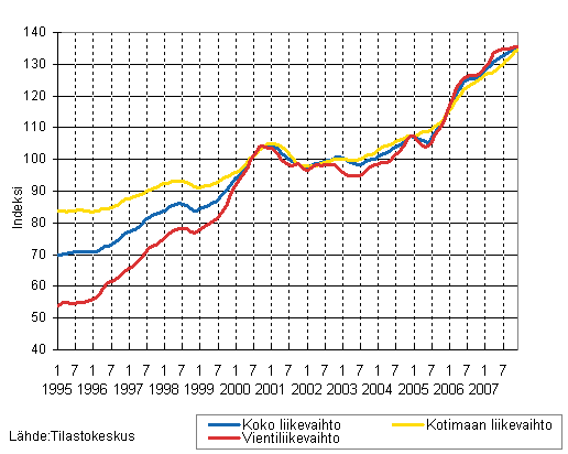 Koko teollisuuden liikevaihdon, kotimaan liikevaihdon ja vientiliikevaihdon trendisarjat 1/1995 - 12/2007, 2000=100