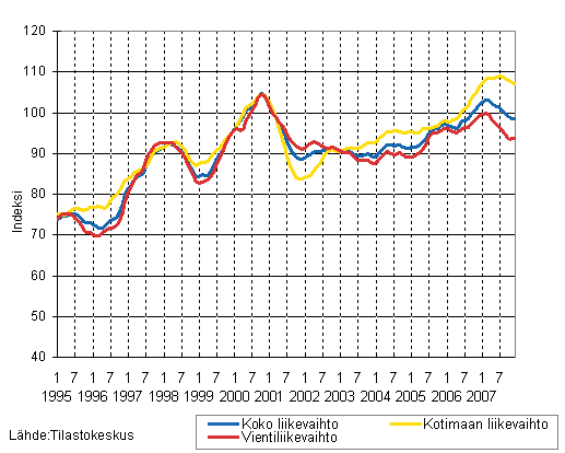 Puu- ja paperiteollisuuden liikevaihdon, kotimaan liikevaihdon ja vientiliikevaihdon trendisarjat 1/1995 - 12/2007, 2000=100
