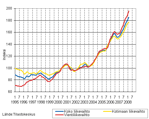 Kemianteollisuuden liikevaihdon, kotimaan liikevaihdon ja vientiliikevaihdon trendisarjat 1/1995 - 2/2008, 2000=100