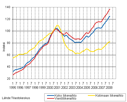 Sähkö- ja elektroniikkateollisuuden liikevaihdon, kotimaan liikevaihdon ja vientiliikevaihdon trendisarjat 1/1995 - 2/2008, 2000=100
