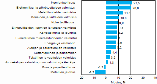 Teollisuuden liikevaihto oli Tilastokeskuksen mukaan joulu-helmikuussa 9,9 prosenttia suurempi kuin vastaavalla ajanjaksolla vuotta aiemmin. Kotimaan myynti kasvoi 8,8 prosenttia ja vientiliikevaihto 11,0 prosenttia vuodentakaisesta.