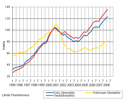 Sähkö- ja elektroniikkateollisuuden liikevaihdon, kotimaan liikevaihdon ja vientiliikevaihdon trendisarjat 1/1995 - 3/2008, 2000=100