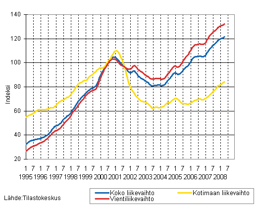 Sähkö- ja elektroniikkateollisuuden liikevaihdon, kotimaan liikevaihdon ja vientiliikevaihdon trendisarjat 1/1995 - 4/2008, 2000=100