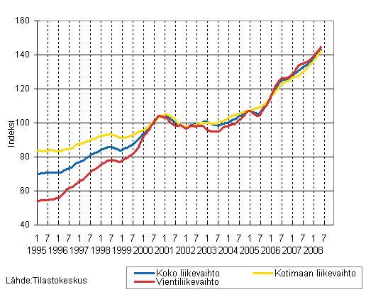 Koko teollisuuden liikevaihdon, kotimaan liikevaihdon ja vientiliikevaihdon trendisarjat 1/1995 - 5/2008, 2000=100