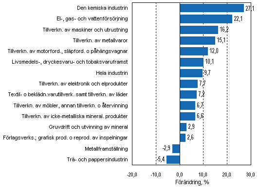 Mest ökade omsättningen under april-juni inom den kemiska industrin, 27,1 procent, och inom el-, gas och vattenförsörjning, 22,1 procent. Ökningen av omsättningen var snabb inom alla undernäringsgrenar av metallindustrin med undantag av metallframställningen. Inom metallframställningen minskade omsättningen med 2,9 procent från året innan. Av de övriga stora näringsgrenarna ökade omsättningen inom tillverkningen av maskiner och utrustning med 16,2 procent, medan den minskade inom trä- och pappersindustrin med 5,4 procent från året innan.