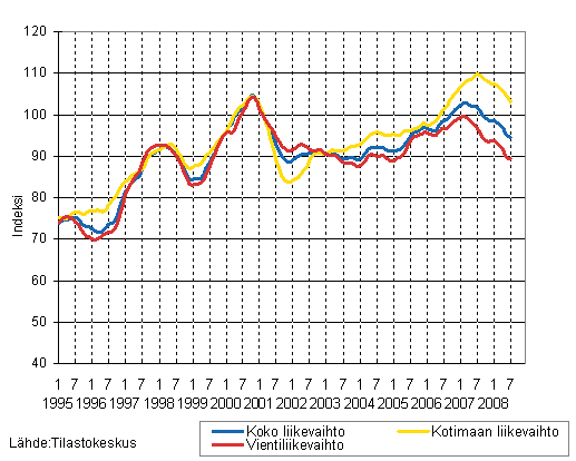 Puu- ja paperiteollisuuden liikevaihdon, kotimaan liikevaihdon ja vientiliikevaihdon trendisarjat 1/1995 - 7/2008, 2000=100