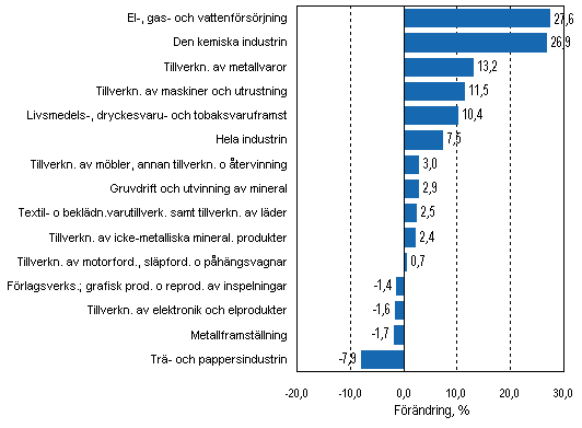 Under maj-juli ökade omsättningen mest inom el-, gas- och vattenförsörjningen, med 27,6 procent, och inom den kemiska industrin, med 26,9 procent. Omsättningsökningen var snabb också inom tillverkningen av metallprodukter, maskiner och utrustning samt inom tillverkningen av livsmedel, drycker och tobak. Däremot vände omsättningen nedåt inom tillverkningen av elektronik- och elprodukter och sjönk med 1,6 procent. Inom metallframställningen minskade omsättningen med 1,7 procent och inom trä- och pappersindustrin med 7,9 procent från året innan.